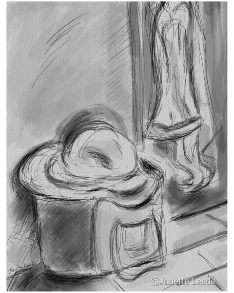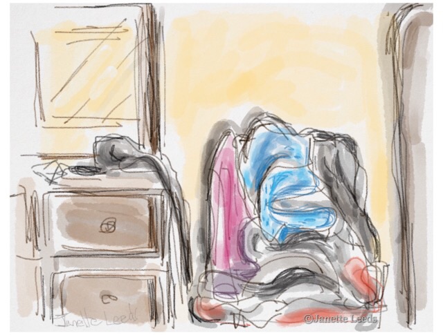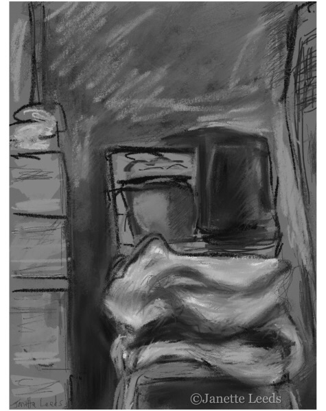 I like drawing crumpled up clothing, or clothes draped over something – I see a lot of that at home. Similar scenes caught my eye in the apartment bedroom. I had a bit of a sketch with ink pens and wash and oil pastels… with no worries of water or paint spilling onto the bed.