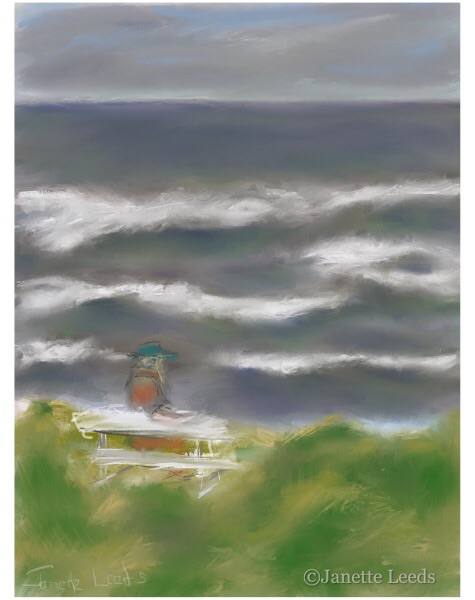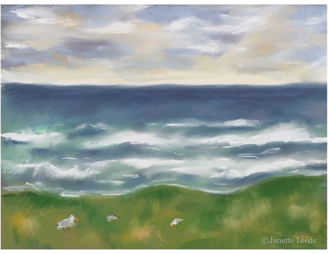 In the first few days, I lay down on the bed a fair bit, feeling quite unwell. However, apart from a cough and sneeze occaisonally, it really was quite lovely: I had a great view of the sea; the sound of the lapping waves was very relaxing; and with my iPad, I had paints at my fingertips! So, between cups of tea, a snooze or two, and a bit of reading; I did a few paintings of the sea – one I shared (a haiku and haiga) in my previous post. Hmm, that’s what I call a holiday.