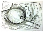 As I did with my garlic drawing, I began this drawing on paper. I again used a fineliner pen. With this one I also added graphite pencil. The pencil is soluble in water.