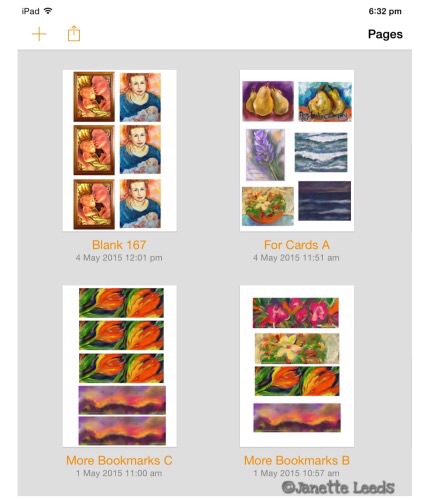 Bookmarks cropped from artworks, smaller prints, in the “Pages” doc library; may add text to some. - With a quick tap I create a pdf in the app, just before I email it to my WordPress blog.