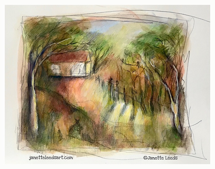 *Began this with quick graphite pencil lines, did a little shading….then added some coloured pencil work, watercolour washes, and a little gouache.