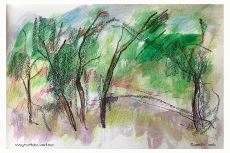 This morning, before I even put on my glasses, and keen to try my new Neopastel, non-watersoluble wax pastels, by Caran D’Ache, I did this ultra quick sketch in one of my A5 sketchbooks. I’ve used the water soluble Neopastels, on and off for years, and these are just as rich in colour and lovely to use.