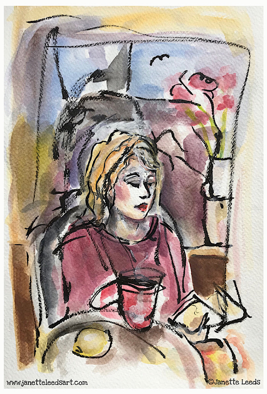 The initial drawing I did quickly with a black ink brush pen. It’s fun to work speedily, not quite knowing where marks will land…I can always use a little gouache to fix bits up later. I then added watercolour and pencil. It’s little smaller than “4 x 6”…I think a touch more red in it would work well.
