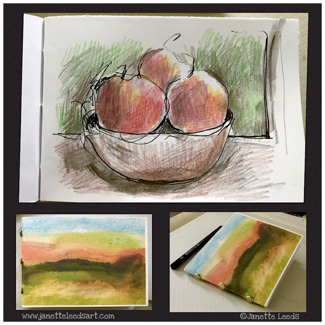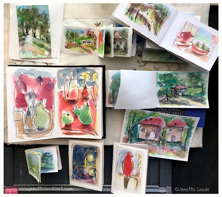 I’ve continued to make some little (A6) sketchbooks. A few are tiny – half the size of the A6 ones. Some I’ve stapled, others I’ve sewn with linen thread, and have also used “Brads” to bind them together. These are a fun way to try out various types of paper – love paper!