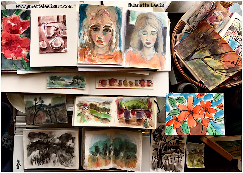 Following are selections from my past months of: painting, drawing and sketchbook making …. Though there’s barely a dab of acrylics in the mix, as I was not happy with many of them. May post some at a later date.